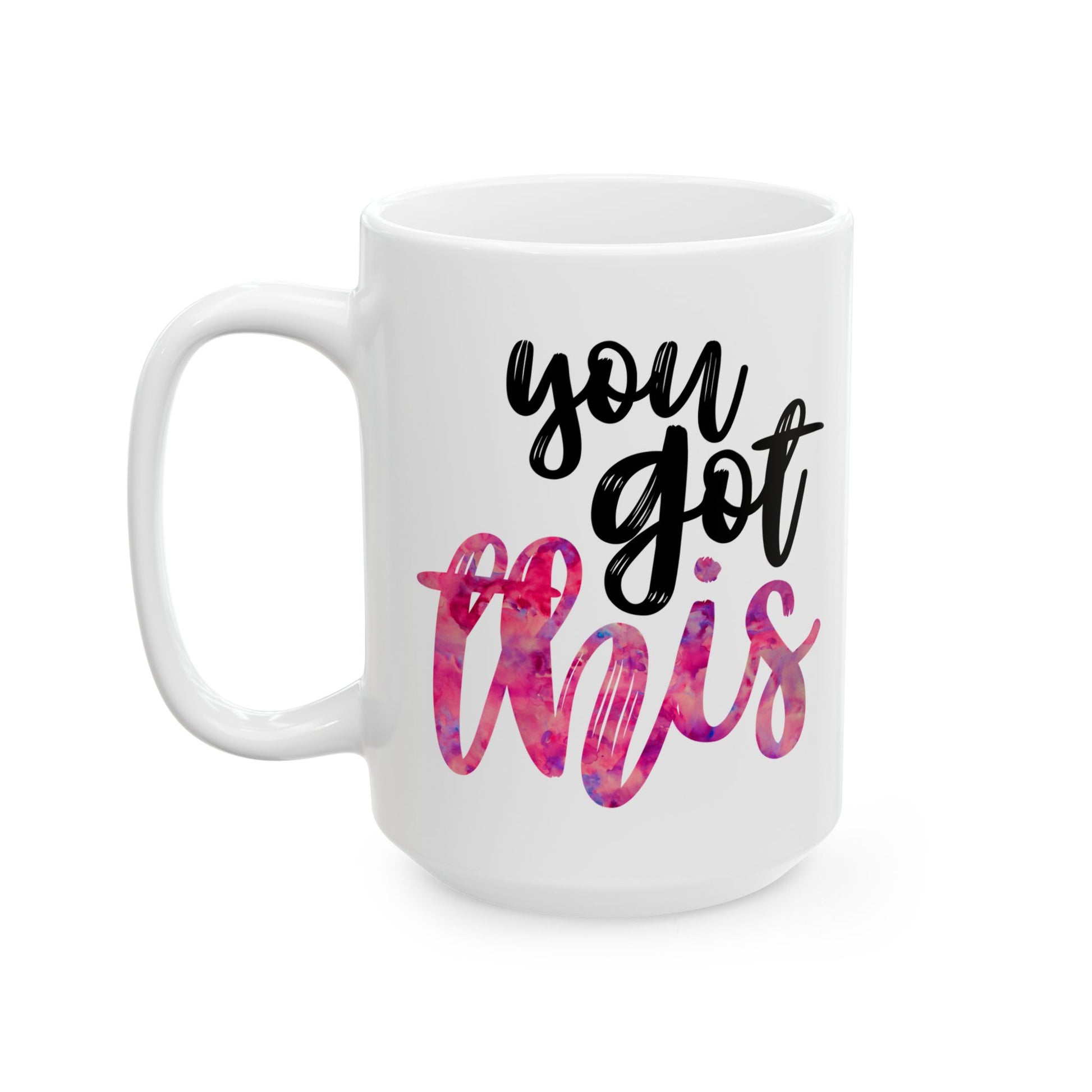 Start your day with a little reminder that you’ve got this. This mug features a soft pink watercolor design and an empowering message to keep you going—whether you’re powering through work, chasing dreams, or just trying to get out the door on time. It’s the perfect pick-me-up for your morning coffee, tea, or matcha moment.